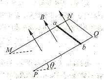 4、选择题  如图所示,足够长的U型光滑金属导轨平面与水平面成 角,其中MN与PQ平行导轨间距为L, 导轨平面与磁感应强度为B的匀强磁场垂直,导轨电阻不计.金属捧a b由静止开始沿导轨下滑,并与两导轨始终保持垂直且良好接触,ab棒接入电路的电阻为R,当流过棒ab某一横截面的电量为q时。此时金属棒的速度大小为v,则金属棒ab在这一过程中