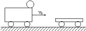 5、简答题 平直的轨道上有一节车厢,车厢以12m/s的速度做匀速直线运动,某时刻与一质量为其一半的静止的平板车挂接时,车厢顶边缘上一个小钢球向前滚出,如图所示,平板车与车厢顶高度差为1.8m,设平板车足够长,求钢球落在平板车上何处?(g取10m/s2)
