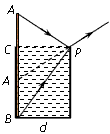 4、选择题 某位同学用下面的方法测量某种液体的折射率。如图所示,他在一个烧杯中装 满了某种透明液体,紧贴着杯口竖直插入一根直尺AB,眼睛从容器边缘的P处斜向下看去,观察到A经液面反射所成的虚像A′恰好与B经液体折射形成的虚像重合。他读出直尺露出液面的长度AC、没入液体中的长度BC,量出烧杯的直径d。由此求出这种透明液体的折射率为( ? )
