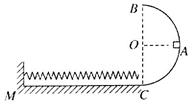 3、计算题 (8分)如图,光滑半圆弧轨道半径为r,OA为水平半径,BC为竖直直径。水平轨道CM与C点相切,轨道上有一轻弹簧,一端固定在竖直墙上,另一端恰位于轨道的末端C点(此时弹簧处于自然状态)。一质量为m的小物块自A处以竖直向下的初速度v0= 滑下,到C点后压缩弹簧进入水平轨道,被弹簧反弹后恰能通过B点。重力加速度为g,求:
