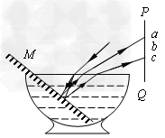 2、选择题 将平面镜M斜放入一个装满清水的碗中,调整平面镜的倾斜角度,让一束太阳光斜射入水中经折射、反射、折射后射到PQ屏上,a、b、c为三个光区,如图所示.现将三瓶相同的红藻放在三个光区,则(设其它光不进入这三个光区)?