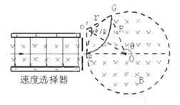 2、计算题 如图所示的装置,左半部为速度选择器,其有一对平行金属板,两板相距为d,电压为U;两板之间有匀强磁场,磁感应强度大小为B0,方向与金属板面平行并垂直于纸面朝里,图中右边有一半径为R、圆心为O的圆形区域,区域内也存在匀强磁场,磁感应强度大小为B,方向垂直于纸面朝里。一电荷量为q的正离子沿平行于金属板面、垂直于磁场的方向射入平行金属板之间,然后沿直线射出平行金属板之间的区域,并沿直径EF方向射入磁场区域,最后从圆形区域边界上的G点射出,已知弧