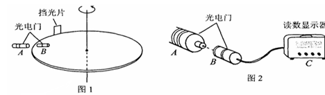 2、填空题 一水平放置的圆盘绕过其圆心的竖直轴匀速转动。盘边缘上固定一竖直的挡光片。盘转动时挡光片从一光电数字计时器的光电门的狭缝中经过,如图1 所示。图2为光电数字计时器的示意图。光源A中射出的光可照到B中的接收器上。若A、B间的光路被遮断,显示器C上可显示出光线被遮住的时间
