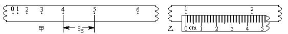 4、实验题 电火花打点计时器使用?①?电源,工作电压?②?伏。当电源的频率是50Hz时,每隔?③?秒打一个点。在“测定匀变速直线运动的加速度”的实验中,得到一条理想的纸带,按每打五个点取一个记数点的方法标出记数点(如图甲).已测得S5=8.80cm,在测S2时,刻度尺的示数如图乙所示,则S2=?④?cm,根据上述数据算得加速度的大小为?⑤?m/s2.