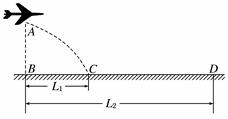 4、计算题 (15分)8月中旬,代号“突击-2013”的陆军航空兵实兵演习在粤东某海域举行.图为轰炸机在海平面上空进行投弹训练的示意图,轰炸机沿水平方向做匀加速直线运动.当轰炸机飞经观察点B点正上方A点时投放第一颗炸弹,经时间T炸弹落在观察点B正前方L1处的C点,与此同时轰炸机投放出第二颗炸弹,最终落在距观察点B正前方L2处的D点,且L2=3L1,空气阻力不计.求: