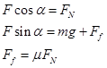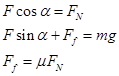 1、选择题 如图所示,质量为m的物体在与水平方向成α角的外力F作用下靠在粗糙的竖直墙上,物体与墙之间的动摩擦因数为μ,若要使物体沿着墙匀速运动,则外力F的大小可以是? (? )