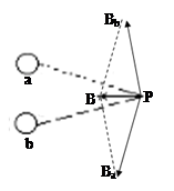 本题解析:若a中向纸里,b中向纸外,根据安培定则判断可知:a在p处产生的磁场Ba方向垂直于aP连线向下.b在p处产生的磁场Bb方向如图所示,根据平行四边形定则进行合成,则得P点的磁感应强度方向水平向左.符合题意.故A正确.
