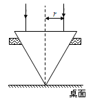 ![]() 4、选择题 如图所示,a、b两种单色光平行地射到平行板玻璃,经玻璃后射出的光线分别为a′、b′,两者间距变窄。下列说法正确的是 5、计算题 (9分)在桌面上有一倒立的玻璃圆锥,其顶点恰好与桌面接触,圆锥的轴(图中虚线)与桌面垂直,过轴线的截面为等边三角形,如图所示。有一半径为r的圆柱形平行光束垂直入射到圆锥的底面上,光束的中心轴与圆锥的轴重合。已知玻璃的折射率为1.5,求光束在桌面上形成光斑的面积。 |