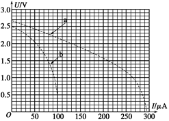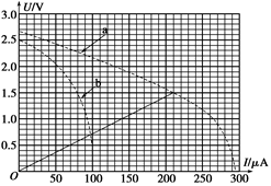 (4)实验一中的路端电压为U1=1.5 V时电路中电流为I1=0.21 mA,连接a中点(0.21 mA,1.5 V)和坐标原点,此直线为此时对应滑动变阻器阻值的外电路电阻(定值电阻)的U—I图,和图线b的交点为实验二中的路端电压和电路电流,如下图,电流和电压分别为I=97 μA,U=0.7 V,则外电路消耗功率为P=UI=0.068 mW