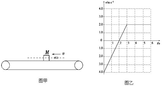 2、简答题 一质量为M=1.0kg的小物块随足够长的水平传送带一起运动,被一水平向左飞来的子弹击中并从物块中穿过,如图甲所示.地面观察者记录了物块被击中后的速度随时间变化的关系如图乙所示,图中取向右运动的方向为正方向.已知传送带的速度保持不变,g取10m/s2.