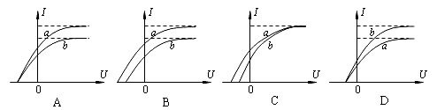 5、选择题 在光电效应实验中,先后用频率相同但光强不同的两束光照射同一个光电管。若实验a中的光强大于实验b中的光强,实验所得光电流I与光电管两端所加电压U间的关系曲线分别以a、b表示,则下列图中可能正确的是(?)