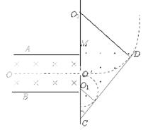 4、计算题 如图所示,两平行金属板AB中间有互相垂直的匀强电场和匀强磁场。A板带正电荷,B板带等量负电荷,板间电场强度为E;磁场方向垂直纸面向里,磁感应强度为B1。平行金属板右侧有一挡板M,中间有小孔O′,OO′是平行于两金属板的中心线。挡板右侧有垂直纸面向外的匀强磁场,磁场应强度为B2。CD为磁场B2边界上的一绝缘板,它与M板的夹角θ=45°,O′C=a,现有大量质量均为m,含有不同电荷量、不同速度的正、负带电粒子(不计重力),自O点沿OO′方向进入电磁场区域,其中有些粒子沿直线OO′方向运动,并进入匀强磁场B2中,求: