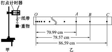 4、填空题 某同学用图甲所示的实验装置验证机械能守恒定律.已知打点计时器所用电源的频率为50Hz,重物质量m=1kg,当地重力加速度大小为g=9.80m/s2.实验中该同学得到的一条点迹清晰的完整纸带如图乙所示,纸带上的第一个点记为O,另选连续的三个点A、B、C进行测量,图中给出了这三个点到O点的距离hA、hB和hC的值.回答下列问题(以下计算结果均保留3位有效数字):