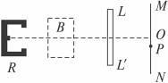 1、选择题 如图19-1-4所示,R是一放射源,虚线框内有匀强磁场B,LL′是一厚纸板,MN是荧光屏.实验中,发现在荧光屏O、P两处有亮斑,则此时磁场方向,到达O、P点的射线与实验相符的是(?)