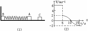 3、简答题  如图(1)所示,物体A、B的质量分别是4kg和8kg,由轻弹簧连接,放在光滑的水平面上,物体B左则与竖直墙壁相接触.另有一个物体C水平向左运动,在t=5s时与物体A相碰,并立即与A有相同的速度,一起向左运动,物块C的速度一时间图象如图(2)所示.