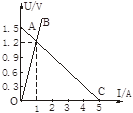 4、填空题 在一次研究性学习的实验探究中,某组同学分别测绘出一个电源的路端电压随电流变化的关系图线,还测绘出了一个电阻两端的电压随电流表化的关系图线,如图中AC和OB.若把该电阻R接在该电源上构成闭合电路(R为唯一用电器),由图可知,外电阻的电阻值是_________,电源的电阻是_________,电源的输出功率是_________,电源的效率是_________.