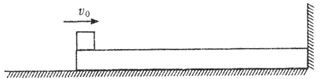 3、计算题 (9分)如图所示,在光滑的水平面上,质量为4m、长为L的木板右端紧靠竖直墙壁,与墙壁不粘连。质量为m的小滑块(可视为质点)以水平速度v0滑上木板左端,滑到木板右端时速度恰好为零。现小滑块以水平速度:滑上木板左端,滑到木板右端时与竖直墙壁发生弹性碰撞,以原速率弹回,刚好能够滑到木板左端而不从木板上落下,求
