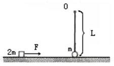 1、计算题 (18分)如图所示,长为L的不可伸长的绳子一端固定在O点,另一端系质量为m的小球,小球静止在光滑水平面上。现用大小为F水平恒力作用在另一质量为2m的物块上,使其从静止开始向右运动,一段时间后撤去该力,物块与小球发生正碰后速度大小变为原来的一半而速度方向不变,小球恰好能在竖直平面内做圆周运动。已知重力加速度为g,小球和物体均可视为质点,试求:
