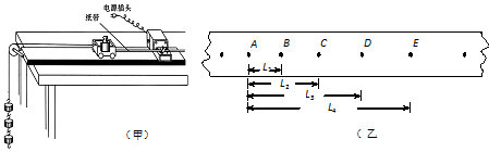 ②如图(乙)所示是某次实验中得到的一条纸带,其中A、B、C、D、E是计数点(每打5个点取一个计数点),其中L1="3.07cm," L2="12.38cm," L3="27.87cm," L4=49.62cm。则打C点时小车的速度为______m/s,小车的加速度是_______m/s2。(计算结果均保留三位有效数字)