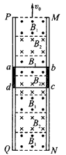 5、计算题 随着越来越高的摩天大楼在各地的落成,至今普遍使用的钢索悬挂式电梯已经渐渐地不适用了。这是因为钢索的长度随着楼层的增高而相应增加,这样这些钢索会由于承受不了自身的重量,还没有挂电梯就会被扯断为此,科学技术人员正在研究用磁动力来解决这个问题。如图所示就是一种磁动力电梯的模拟机,即在竖直平面上有两根很长的平行竖直轨道,轨道间有垂直于轨道平面的匀强磁场B1和B2,且B1和B2的大小相等,方向相反,即B1=B2=1 T,两磁场始终竖直向上做匀速运动,电梯轿厢固定在如图所示的一个用超导材料制成的金属框abcd内(电梯轿厢在图中未画出),并且与之绝缘。电梯载人时的总质量为5×103 kg,所受阻力Ff=500 N,金属框垂直于轨道的边长Lcd=2 m,两磁场的宽度均与金属框的边长Lad相同,金属框在整个回路的电阻R=9.5×10-4 Ω,假如设计要求电梯以v1=10 m/s的速度向上匀速运动,g=10 m/s2,那么: