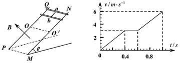 1、计算题 如图所示,两根质量均为0.1 kg完全相同的导体棒a、b,用绝缘轻杆相连置于由金属导轨PQ、MN架设的斜面上。已知斜面倾角θ为53°,a、b导体棒的间距是PQ、MN导轨间间距的一半,导轨间分界线OO′以下有方向垂直斜面向上的匀强磁场。当a、b导体棒沿导轨下滑时,其下滑速度v与时间的关系图像如下图所示。若a、b导体棒接入电路的电阻均为1Ω,其它电阻不计,取g=10 m/s2,sin53°=0.8,cos53°=0.6,试求: