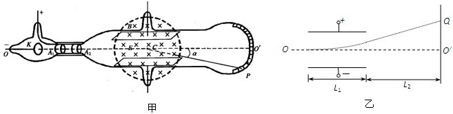 (3)有位同学提出了该装置的改造方案,把球形荧屏改成平面荧屏,并画出了如图乙的示意图.已知电场平行金属板长度为L1,金属板右则到荧屏垂直距离为L2.实验方案的第一步不变,可求出电子在复合场中沿直线向右飞行的速度.第二步撤去磁场,保持电场和电子的速度不变,使电子只在电场力的作用下发生偏转,打在荧屏上出现一个亮点P,通过屏上刻度可直接读出电子偏离屏中心点的距离