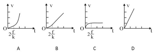 2、选择题 如图甲所示,静止在光滑水平面上的长木板B(长木板足够长)的上面放着小物块A,某时刻,B受到水平向右的外力F作用,F随时间t变化规律如图乙所示,即F=kt,其中k为已知常数。若物体之间的滑动摩擦力f的大小等于最大静摩擦力,且A、B的质量相等,则下列图中可以定性地描述物块A的v-t图像的是(?)