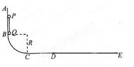 5、计算题 如图所示,在竖直面内有固定轨道ABCDE,其中BC是半径为R的四分之一圆弧轨道,AB(AB>R)是竖直轨道,CE是足够长的水平轨道,CD>R。AB与BC相切于B点,BC与CE相切于C点,轨道的AD段光滑,DE段粗糙且足够长。一根长为R的轻杆两端分别固定有质量均为m的相同小球P、Q(视为质点),将轻杆锁定在图示位置,此位置Q与B等高。现解除锁定释放轻杆,轻杆将沿轨道下滑,Q球经过D点后,沿轨道继续滑行了3R而停下。重力加速度为g。求: