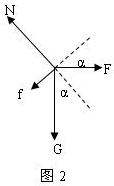 当力F较大时,物块受力图如图2.根据平衡条件得f=Gsinα-Fcosα,当F增大时,f增大.故B正确.N=Gcosα+Fsinα,F增大时,N增大.故C正确.物块所受斜面的作用力与重力和力F的合力大小相等,等于