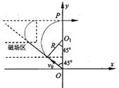 2、计算题 (16分)如图所示,在xoy平面内第二象限的某区域存在一个矩形匀强磁场区,磁场方向垂直xoy平面向里,边界分别平利于x轴和y轴。一电荷量为e、质量为m的电子,从坐标原点为O以速度v0射入第二象限,速度方向与y轴正方向成45°角,经过磁场偏转后,通过P(0,a)点,速度方向垂直于y轴,不计电子的重力。
