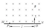 4、计算题 (8分)如图所示,MN表示真空室中垂直于纸面放置的感光板,它的一侧有匀强磁场,磁场方向垂直于纸面向里,磁感应强度大小为B. 一个电荷量为q的带电粒子从感光板上的狭缝O处以垂直于感光板的初速度v射入磁场区域,最后到达感光板上的P点. 经测量P、O间的距离为l,不计带电粒子受到的重力。求: