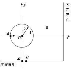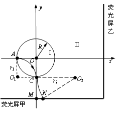 5、计算题 如图所示,圆心在原点、半径为R的圆将xOy平面分为两个区域,在圆内区域Ⅰ(r≤R)和圆外区域Ⅱ(r>R)分别存在两个磁场方向均垂直于XOY平面的匀强磁场;垂直于XOY平面放置了两块平面荧光屏,其中荧光屏甲平行于X轴放置在Y轴坐标为-2.22R的位置,荧光屏乙平行于Y轴放置在X轴坐标为3.5R的位置。现有一束质量为m、电荷量为q(q>0)、动能为E0的粒子从坐标为(-R,0)的A点沿X轴正方向射入区域Ⅰ,最终打在荧光屏甲上,出现坐标为(0.4R,? -2.2R,)的亮点