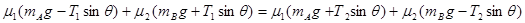 4、选择题 如图所示,A、B两木块质量分别是mA、mB,与水平地面的摩擦因数分别为μ1、μ2,两木块放在水平面上,它们之间用细线相连,两次连接情况中细线倾斜方向不同但倾角一样。先后用相同的水平力F拉着A、B一起匀速运动,则μ1、μ2之比是( )