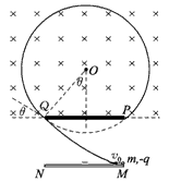 3、计算题 如图所示,MN、PQ是平行金属板,板长为L,两板间距离为 ,PQ板带正电,MN板带负电,在PQ板的上方有垂直纸面向里的匀强磁场。一个电荷量为q、质量为m的带负电粒子以速度v。从MN板边缘沿平行于板的方向射入两板间,结果粒子恰好从PQ板左边缘飞进磁场,然后又恰好从PQ板的右边缘飞进电场。不计粒子重力。求: (1)两金属板间所加电场的场强大小; (2)匀强磁场的磁感应强度B的大小。