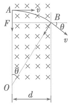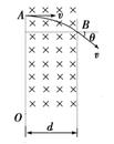 电子在匀强磁场中运动时,只受洛伦兹力作用,故其轨道是圆弧的一部分.又因洛伦兹力与速度v垂直,故圆心应在电子穿入和穿出时洛伦兹力延长线的交点上.从图中可以看出,AB弧所对的圆心角θ=30°= ,OB即为半径r 由几何关系可得:r= =2d 由牛顿第二定律得:qvB= 解得:m= = 带电粒子通过AB弧所用的时间,即穿过磁场的时间为:t= T= × = = .