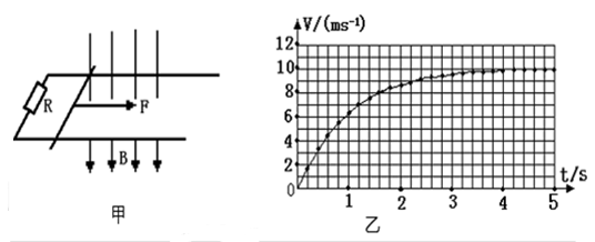 3、计算题 (12分)如图甲所示,放置在水平桌面上的两条光滑导轨间的距离L=1m,质量m=1kg的光滑导体棒放在导轨上,导轨左端与阻值R=4Ω的电阻相连,导体棒及导轨的电阻不计,所在位置有磁感应强度为B=2T的匀强磁场,磁场的方向垂直导轨平面向下。现在给导体棒施加一个水平向右的恒定拉力F,并每隔0.2s测量一次导体棒的速度,乙图是根据所测数据描绘出导体棒的v-t图象。设导轨足够长,求: