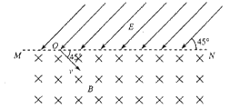 4、计算题 如图,直线MN 上方有平行于纸面且与MN成45°的有界匀强电场,电场强度大小未知;MN下方为方向垂直于纸面向里的有界匀强磁场,磁感应强度大小为B.今从MN 上的O点向磁场中射入一个速度大小为v、方向与MN成45°角的带正电粒子,该粒子在磁场中运动时的轨道半径为R .该粒子从O点出发记为第一次经过直线MN ,第五次经过直线MN时恰好又通过O点.不计粒子的重力.