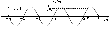 5、计算题 图为沿x轴向右传播的简谐横波在t=1.2 s时的波形,位于坐标原点处的观察者测到在4 s内有10个完整的波经过该点。