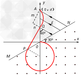 (3)粒子进入电场后做类平抛,设垂直于电场方向的距离为m,电场方向的距离为n,粒子离开电场时经过y轴,其位置坐标为A(0,d),所以