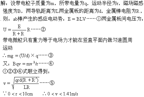 ,导轨和连线的电阻不计,整个装置处于如图所示的匀强磁场中.当ab以速率v向右匀速运动时,恰能使一带电微粒也以速率v在金属板间作匀速圆周运动,求ab匀速运动的速率v的取值范围(g取10m/ )