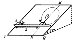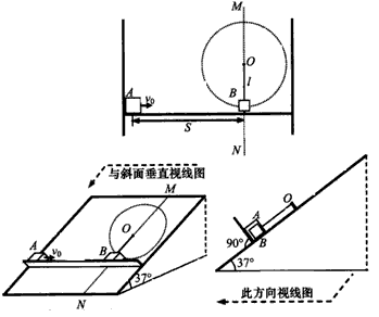 3、计算题 如图所示,倾角为37°的足够大斜面以直线MN为界由两部分组成,MN垂直于斜面的水平底边PQ且其左边光滑右边粗糙,斜面上固定一个既垂直于斜面又垂直于MN的粗糙挡板。质量为m1=3 kg的小物块A置于挡板与斜面间,A与挡板间的动摩擦因数为μ1=0.1。质量为m2=1 kg的小物块B用不可伸长的细线悬挂在界线MN上的O点,细线长为l=0.5 m,此时,细线恰好处于伸直状态。A,B可视为质点且与斜面粗糙部分的动摩擦因数均为μ2=0.3,它们的水平距离s=7.5 m.现A以水平初速v0=5 m/s向右滑动并恰能与B发生弹性正碰。g=10 m/s2,求: