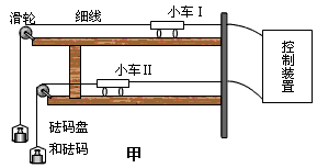 5、实验题 在“探究加速度与物体质量、物体受力的关系”活动中,某小组设计了如图甲所示的实验装置。图中上下两层水平轨道表面光滑,两小车前端系上细线,细线跨过滑轮并挂上砝码盘,两小车尾部细线连到控制装置上,实验时通过控制装置使两小车同时开始运动,然后同时停止。