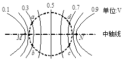 3、选择题 如图所示,实线是电场中的等势线,为中心对称图形,部分等势线的上端标出了其电势数值;虚线是以中心点为圆心的圆,a、b、c、d是圆周跟等势线的交点;M、N是中轴线跟等势线的交点。下列说法正确的是