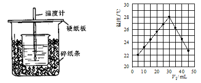 (2)将V1 mL 1.0 mol/L HCl溶液和V2 mL未知浓度的NaOH溶液混合均匀后测量并记录溶液温度,实验结果如图所示(实验中始终保持V1+V2=50 mL)。