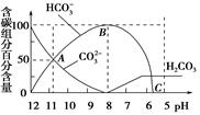 5、选择题 常温下在20 mL 0.1 mol/L Na2CO3溶液中逐渐滴加入0.1 mol/L HCl溶液40 mL,溶液的pH逐渐降低,此时溶液中含碳元素的微粒物质的量浓度的百分含量(纵轴)也发生变化(CO2因逸出未画出),如图所示,下列说法不正确的是