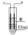 (3)如图,在粗试管中加入饱和的KI溶液,然后再加入苯,插入两根石墨电极,接通直流电源。连接电源负极的电极为?极,电极反应式为?。通电一段时间后,断开电源,振荡试管,上层溶液为?色。