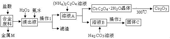 本题解析:分析题给流程知,合金废料(主要含Fe、Cu、Co、Li等)中与盐酸反应生成氯化亚铁、氯化钴、氯化锂和氢气,故金属M为铜,浸出液为氯化亚铁、氯化钴、氯化锂的混合液;浸出液加H2O2将亚铁离子氧化为铁离子,在加入氨水调节pH是铁离子转化为氢氧化铁沉淀,经过滤得滤渣氢氧化铁,溶液A为氯化锂和氯化钴的混合液;向氯化锂和氯化钴的混合液中加入草酸铵生成草酸钴晶体,在空气中灼烧得氧化钴;溶液B中加入碳酸钠溶液生成碳酸锂固体C。(1)金属M为Cu,操作1为过滤;(2)加入H2O2的作用是2Fe2++H2O2+2H+=2Fe3++2H2O,加入氨水的作用是调节溶液的pH使Fe3+转化为Fe(OH)3沉淀;(3)CoC2O4·2H2O充分焙烧生成氧化钴、二氧化碳和水,化学方程式为4CoC2O4·2H2O+3O2