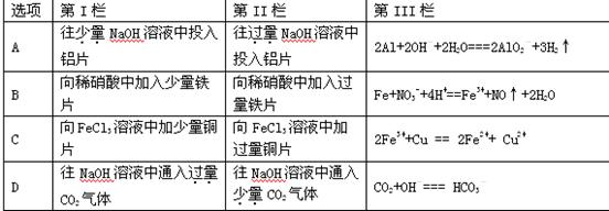4、选择题 下表所列各组第I栏中的化学反应与第II栏中的化学反应都可以用第III栏中的离子方程式表示的是
