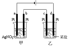 5、选择题 如图所示的装置,通电一段时间后,测得甲池中某电极质量增加2.16 g,乙池中某电极上析出0.24 g某金属,下列说法正确的是