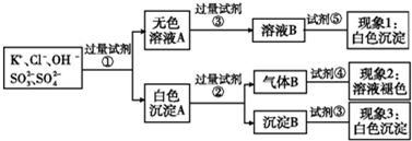 参考答案:检验SO32-、SO42-和Cl-,先加入试剂分离氯离子与SO32-、SO42-,然后分别检验氯离子、亚硫酸根离子和氯离子,所以试剂①为Ba(NO3)2溶液,无色溶液为含有氢氧根离子和氯离子等混合液,加入硝酸银前必须将溶液中和,使用的是硝酸,注意不能够使用盐酸,所以试剂③为硝酸,试剂⑤为检验氯离子的硝酸银溶液;白色沉淀A为亚硫酸钡和亚硫酸钡的混合物,可以加入试剂②稀盐酸,亚硫酸钡沉淀溶液,生成了二氧化硫气体,再加入溴水具有生成的气体为二氧化硫;白色沉淀B不溶于盐酸和试剂③硝酸,所以B为硫酸钡,